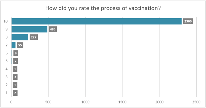 The process of booking and vaccination was viewed positively by the majority of respondents. The booking process was rated as very good to excellent (8-10) by 95.5% and the vaccination process was rated as very good to excellent by 97.3%.