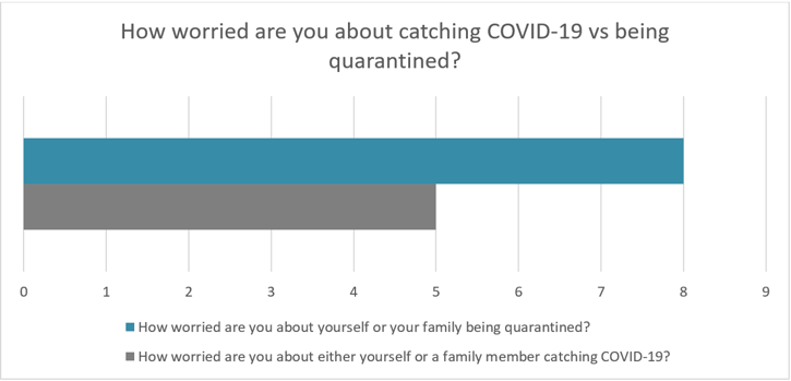 Fig 3. A graph that illustrates the median of our survey's respondents' view on their worries about catching COVID-19 vs being quarantined. 1 = not worried at all, 10 = extremely worried.