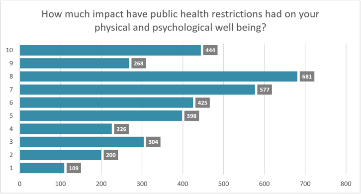 Fig 4. A graph that illustrates our survey's respondents' view on the impact Hong Kong's public health restrictions had on their physical and psychological well being. 1 = no impact at all, 10 = extremely impacted.