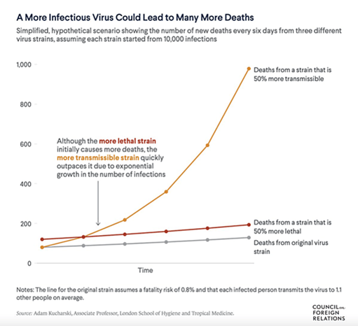 The new variants have already spread worldwide. These variants have led to accelerations of the epidemic in the regions in which they seed. Epidemic modelling of the variant infections confirms an increase in the R0 values, an increase in the viral load and an effective increase in transmission rates for the variants of concern of around 50-70% for the Alpha variant, more recent investigations suggest that the Delta variant may be a further 40% more transmissible. The Omicron variant is even more transmissible. There have been some reports that the new variants may be associated with a change in disease severity but there are also factors of overwhelming of health systems during evolving epidemics. More research is needed to be certain about disease severity.