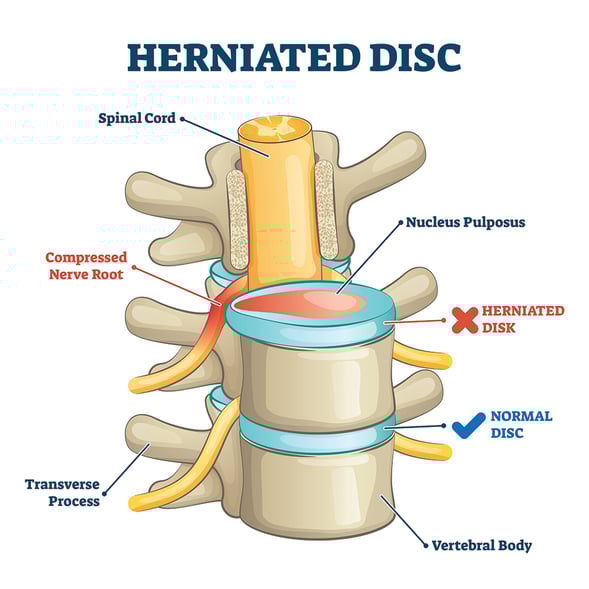 A disc herniation is the medical terminology for a slipped disk. Disc herniation refers to the problem caused by when the rubbery disc between the individual bones of the spine slips out and starts affecting the nerves surrounding the spine. Depending on where and how the disc slips, it can cause pain, numbness or weakness in the limbs.