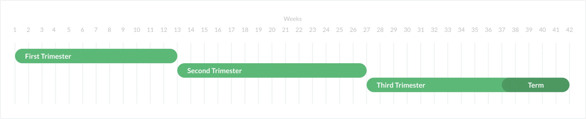 Typically a pregnancy lasts 40 weeks but anything from weeks 37-42 is normal and considered to be ‘term’. These 40 weeks are split into 3 different trimesters of development.