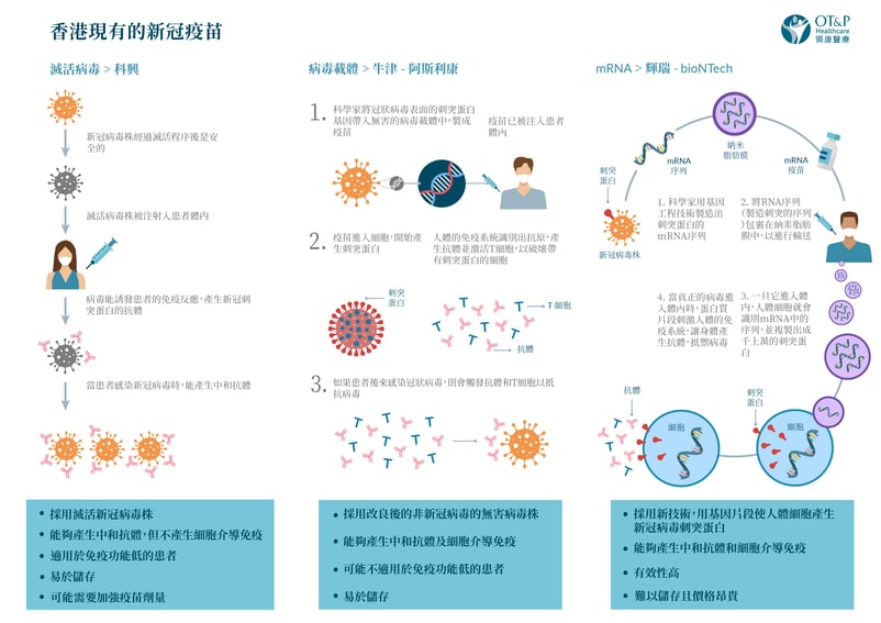 1. 復必泰:這是mRNA疫苗,它應用了新型預防傳染病的醫療科技,將mRNA注射入我們體内。注射後,此疫苗指導我們的細胞製造出「刺突蛋白」,從而對新冠病毒產生免疫反應。該新冠疫苗(Moderna莫德納疫苗亦是mRNA疫苗)有最高的有效性[1]。它已被多個國家緊急批准使用。這是一種全新的醫療技術,所有主要的安全及有效性數據已發布於新聞稿内,而非通過同行評審醫學期刊公布[2]。由於此疫苗必須儲存於極低的溫度下,冷鏈儲運問題對於物流公司而言將會是一個挑戰。該疫苗須分2針注射,每針間隔21天。