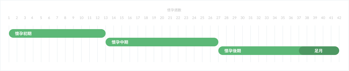 通常懷孕持續40週,37-42週之間都被認為是「足月」。40週當中分為3個不同孕期:第一孕期、第二孕期和第三孕期,又常稱之為懷孕初期、中期及後期。