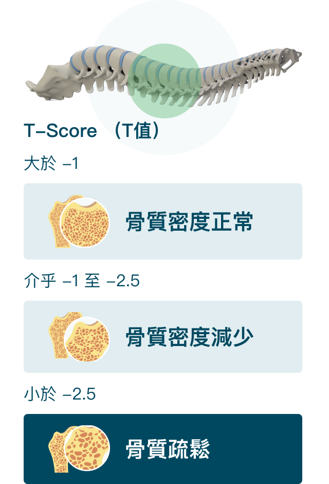 DEXA掃描使用T值來解釋結果。T值表示你的骨密度與年輕健康的成年人相比的情況: